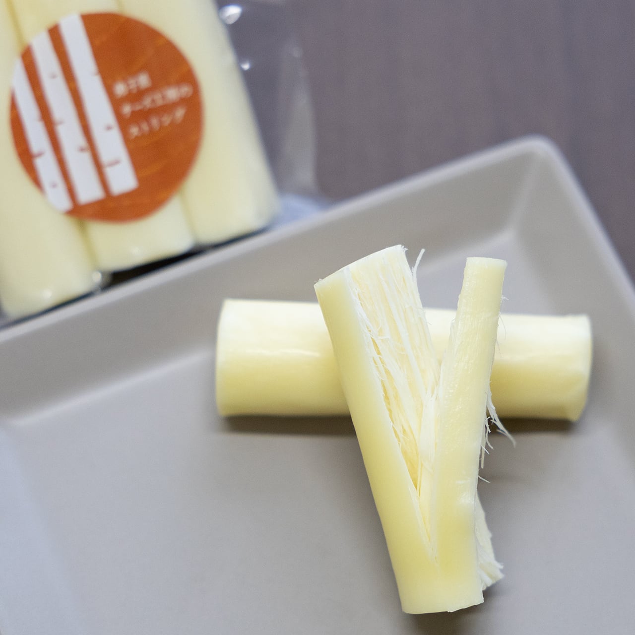 ストリングチーズはモッツァレラチーズをベースに水分を抜いて作られたチーズです。糸のように割けるのが特徴で、優しいミルクの風味を生かすため塩のみの味付けとし、ミルキーな味わいに仕上がっています。